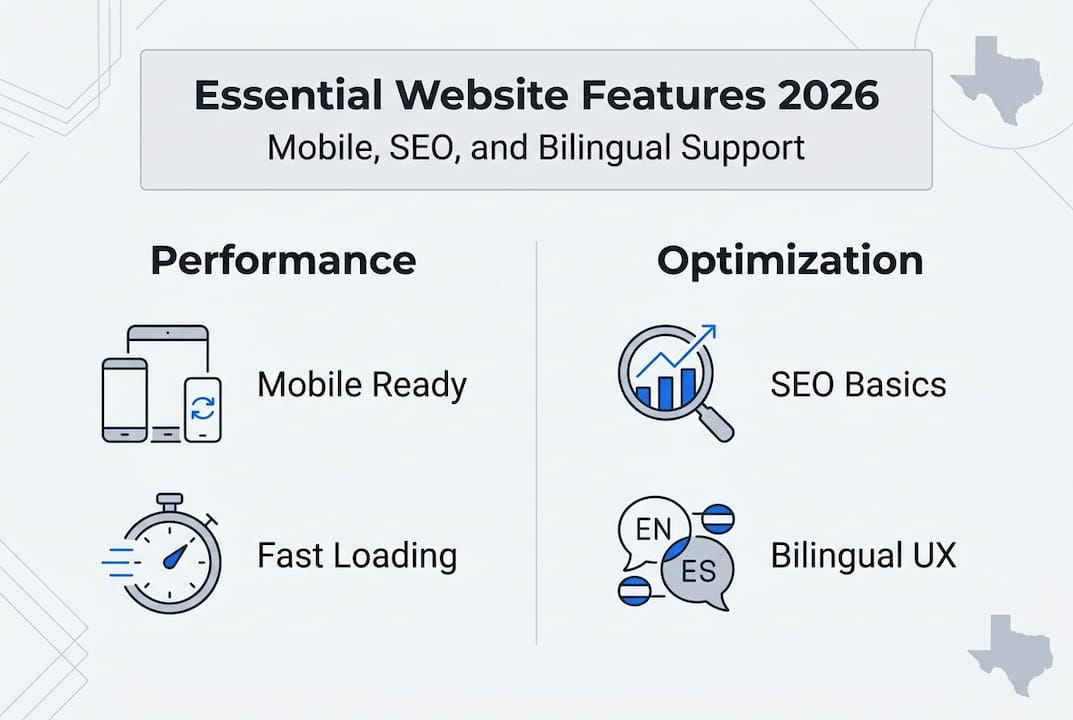 Three features separate high-performing Texas business websites from forgettable ones. Mobile responsiveness, SEO optimization, and bilingual support directly impact how customers find, experience, and engage with your site.