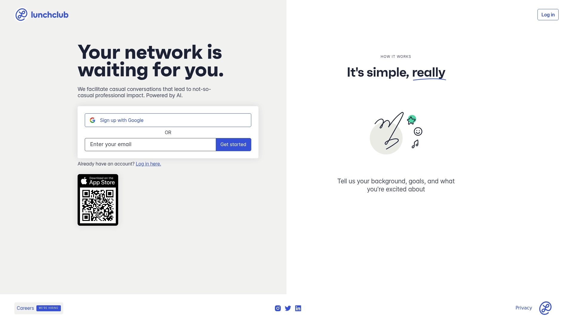 Lunchclub centers on AI-powered matching and personalized introductions that pair you with relevant contacts based on your profile and objectives. Users can sign up with Google and start receiving matches designed to create meaningful, professional conversations.