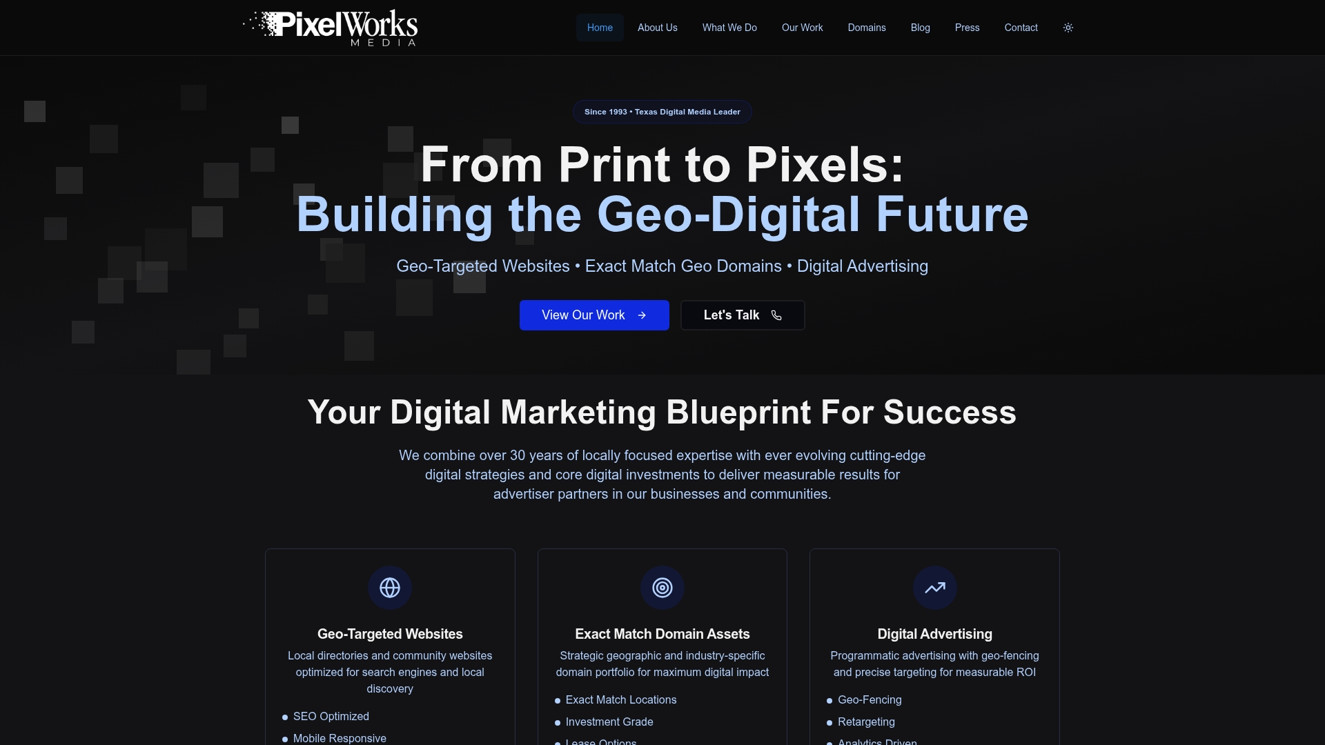 PixelWorks Media is a Texas based firm with more than 30 years building locally focused digital assets for regional businesses. Bottom line: they excel at local visibility through geo targeted websites and exact match domain assets, but their Texas emphasis narrows the audience.