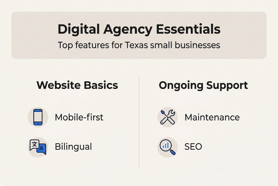 Many Texas small business owners feel overwhelmed when trying to understand what a digital agency actually does. Misconceptions about high costs, confusing service packages, and complicated development processes create hesitation. This confusion often leads to delayed decisions or choosing the wrong partner. This guide cuts through the noise to explain exactly what a digital agency is, how it works, and what Texas small businesses should look for in 2026. You'll learn about affordable pricing, fast turnaround times, bilingual support, and mobile-responsive design that drives real results for local entrepreneurs.